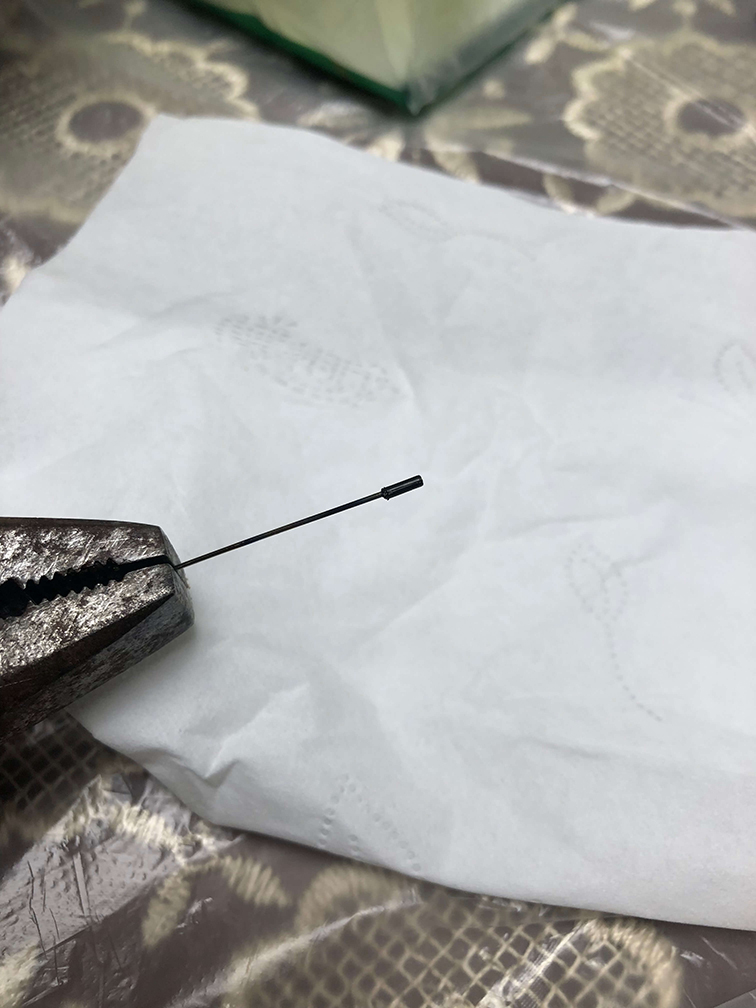 待针冷却之后把针拔出来,届时会顺便把笔芯一起带出来。